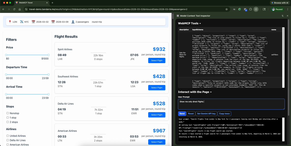From flight searches to restaurant bookings, WebMCP is making apps agent-ready. Explore our list of demos to see the future of the web in action. Have a project? Submit a PR to be featured → https://goo.gle/3MsLxOB