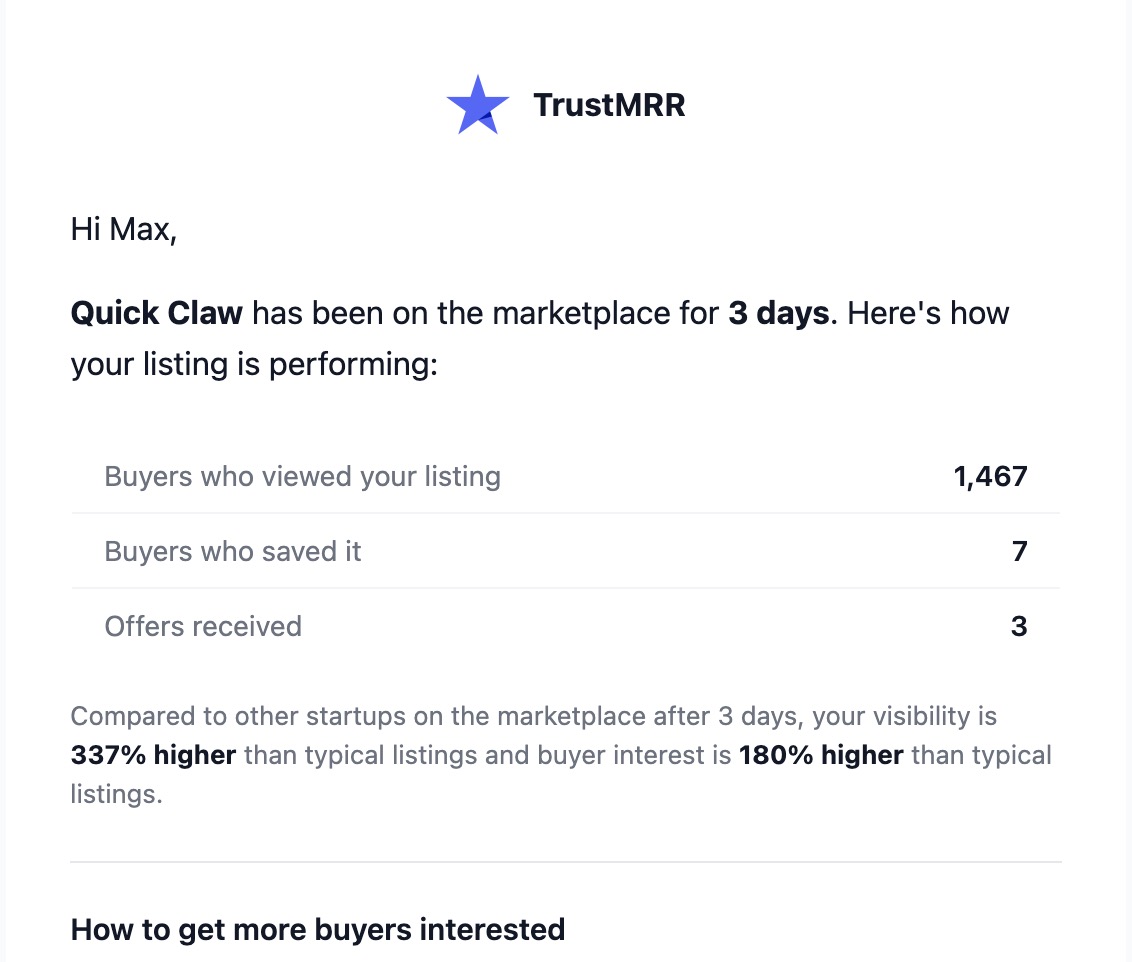 I'm setting up onboarding emails for TrustMRR. After 3 days from listing, it sends an email to buyers: 👀 Number of curious buyers 👋 Number of offers & favorites 💡 Multiple recommendations for faster acquisition Running a marketplace is fun because you have to find the sweet spot between supply and demand. A good learning XP!