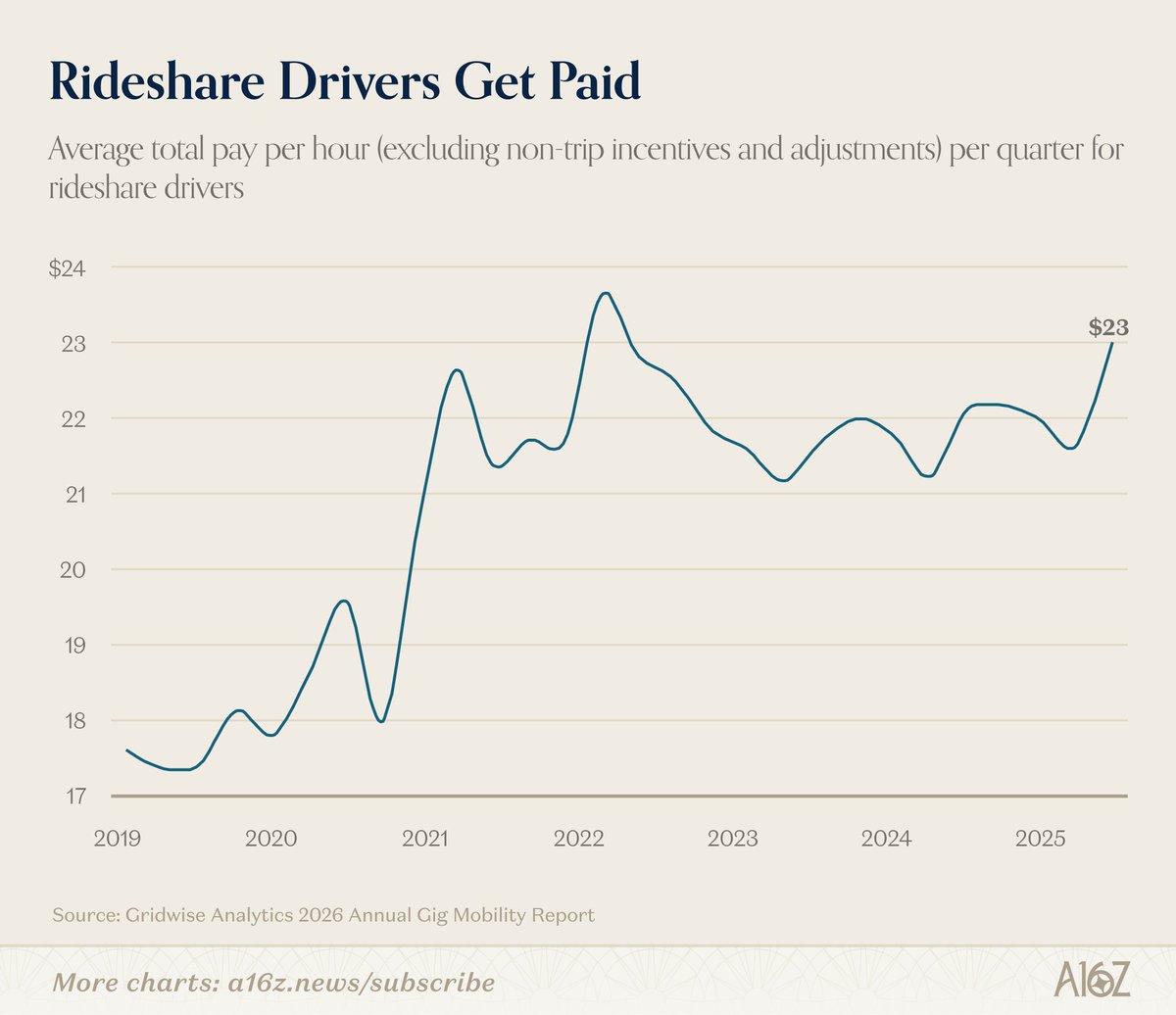 Rideshare drivers' hourly pay peaked in 2022 Charts of the week: https://a16z.news/p/charts-of-the-week-m…