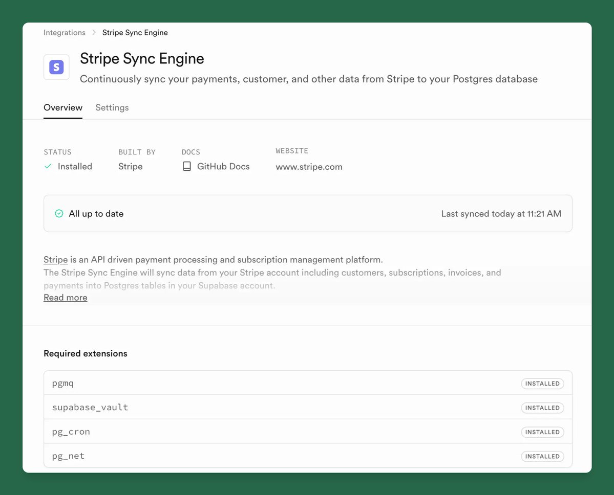 Sync Stripe Data to Your Supabase Database in One Click > http://supabase.com/blog/stripe-sync-eng…