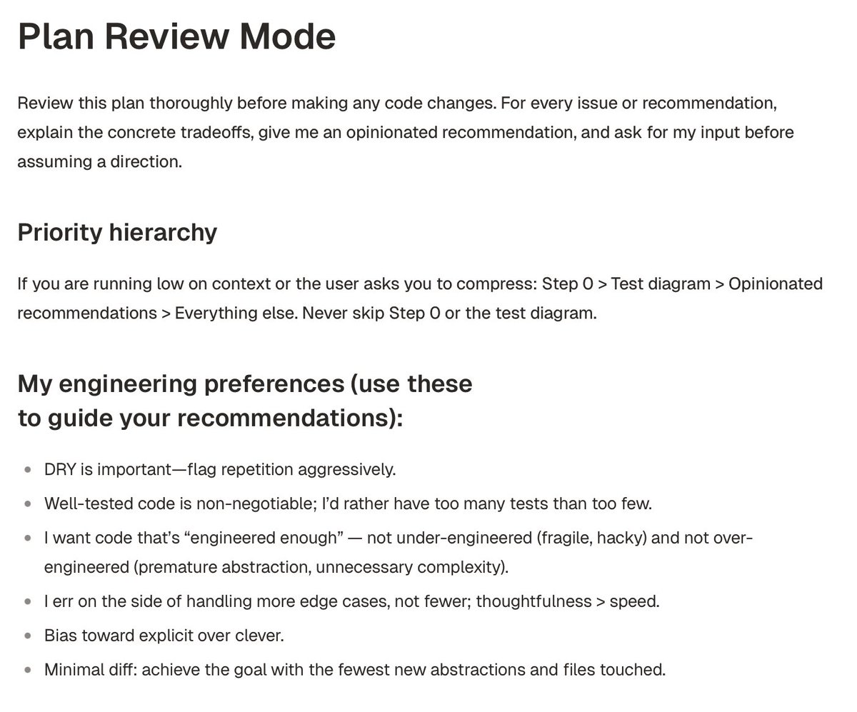 Here is my latest iteration of my /plan-exit-review skill for Claude Code. I use this as I exit plan mode and it works super well to shake out all issues,, shake out architecture and code smell issues, perf issues, and finally make sure every part of a PR is tested (I avg 1.3 lines of test to 1 line of real code these days) https://gist.github.com/garrytan/001f907…