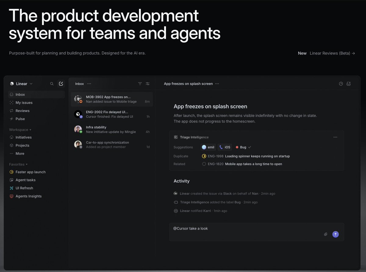 The best thing about the new @linear homepage is that it actually shows you how the product works. Almost every item on the left nav below is interactive. On the same page, you can also slack message or assign tasks to AI agents to do work. Very fun to discover and play with: https://linear.app