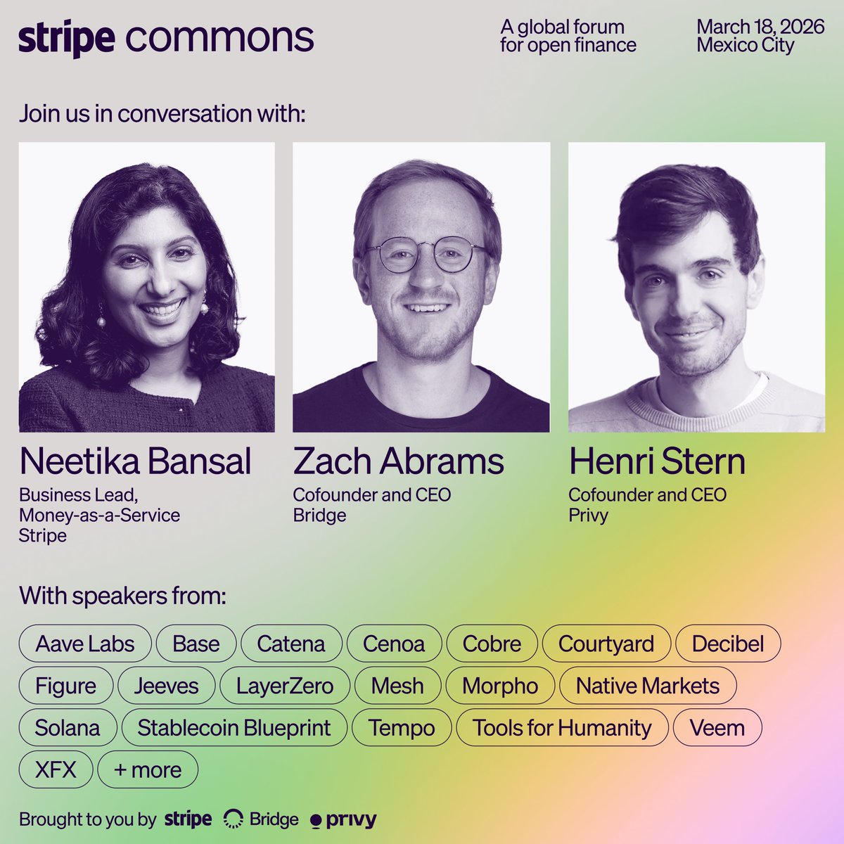 We're hosting Stripe Commons, a global forum for open finance, with @stablecoin and @privy_io on March 18 in Mexico City. If you're a founder or operator building products on open financial rails, apply to join us: https://luma.com/stripecommonscdmx.