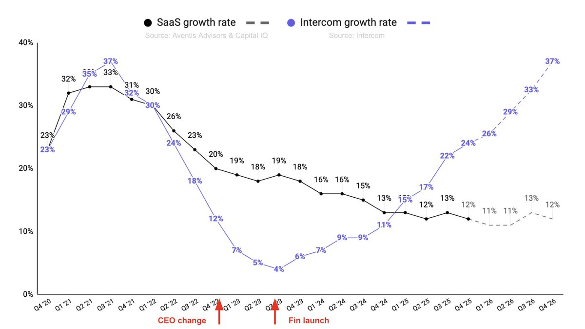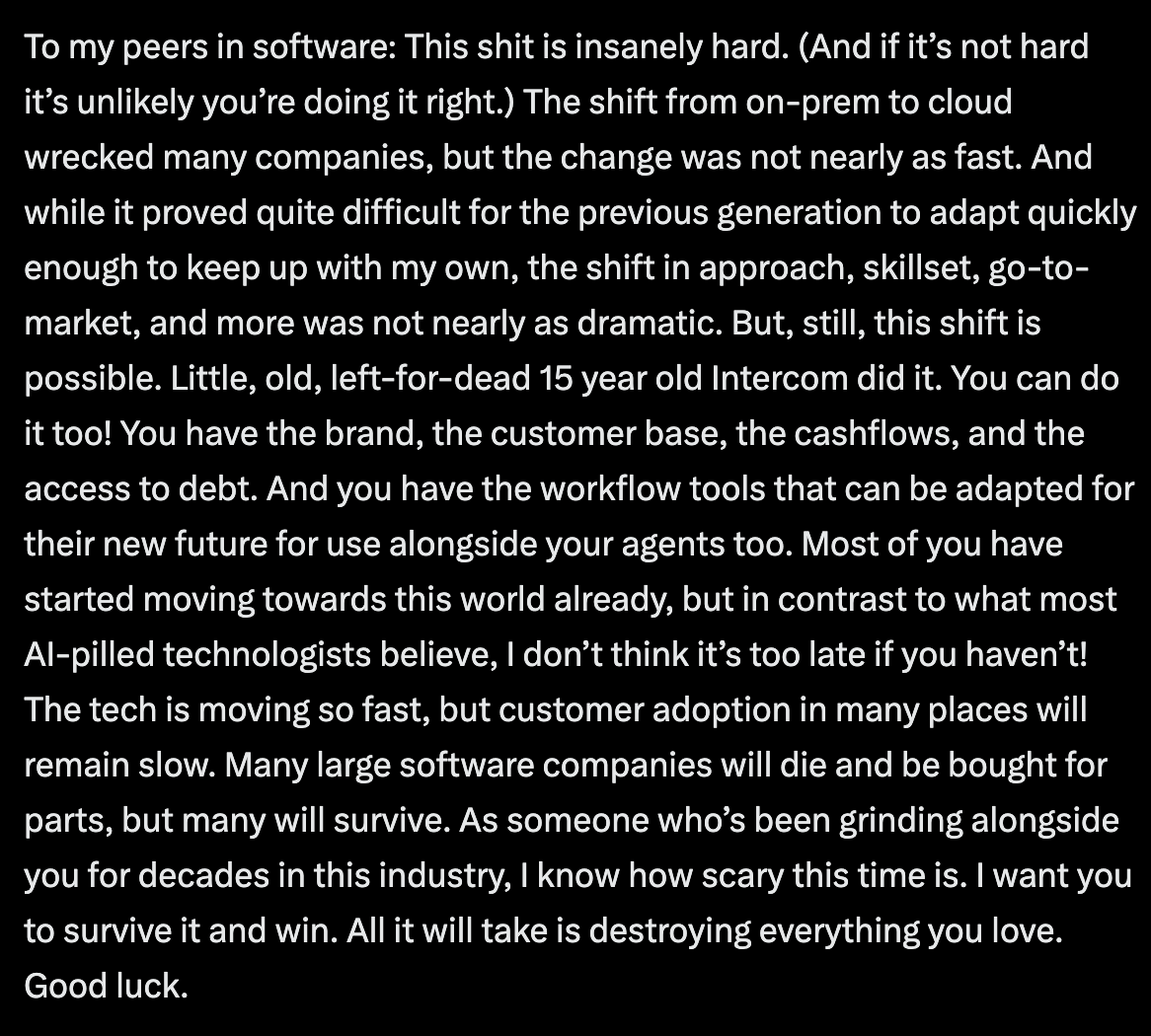Intercom was in a bad spot a few years ago. We invested well before that and didn't think we'd see a meaningful return. Now they're doing $400M ARR. @eoghan's message to SaaS incumbents: "I know how scary this time is. I want you to survive it and win. All it will take is destroying everything you love. Good luck."