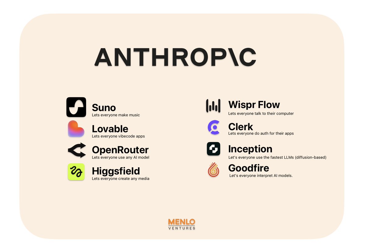 2026 has been a generational year for us at Menlo already. — Anthropic is the fastest growing company of all time adding $4.5B run rate in 42 days after the $380B round. We put ~$1B into it starting from the Series C — Suno reaches 100M users and $300M ARR — Lovable is the 5th most adopted and 2nd fastest growing AI vendor, going 0 to $200M in a yr — OpenRouter grew 2.5x in 1.5 months. On track to 1 quadrillion token annual run rate. — Higgsfield hits $200M run rate with creative tools and a $1B+ valuation. — Wispr Flow continues to grow 40% MoM with a 70% 1 year retention and wins some massive enterprise contracts — Clerk becomes #4 fastest growing vendor in the league of Google, Atlassian and Replit — Inception launches the first and best reasoning diffusion model that is the fastest for its intelligence at 1000tokens/s — Goodfire, Anthropic's first direct investment, hits $1B+ val and discovers novel biomarkers for Alzheimer's Most VCs don't believe in this model of being picky, low volume investors. We do very few investments (up to 2/partner/yr) and we go early. 5 of these were partnerships since the Seed. It's been working for us so far (even though we've missed a lot too!) It's an privilege to work with founders who run through walls and take on so much risk to bring new things into the world. And we're very lucky to play a small part in that! Still a lot of work to do.