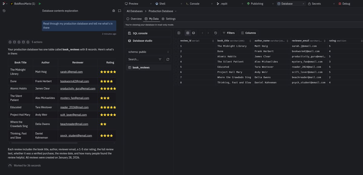 Replit creates a separate production (user-facing) database from your development database, and handles safe migrations between them. But sometimes you need to query your production database for data analysis or debugging... So now Agent has read-only access. Enjoy!