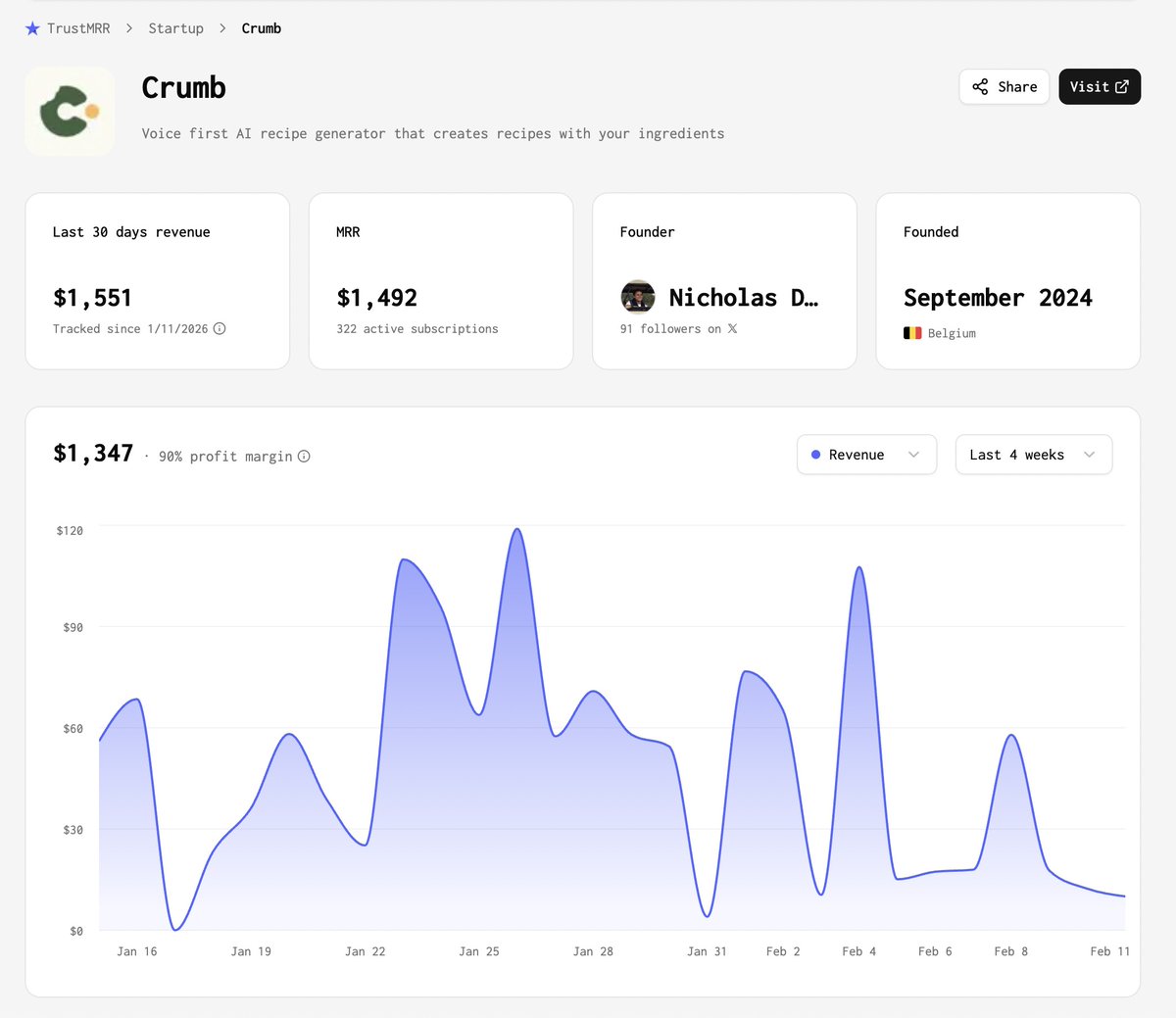 AI recipe maker đ§đťâđł iOS app for sale on TrustMRR: - $1.5K MRR - 90% profit margin - 4.7 âď¸âď¸âď¸âď¸âď¸ rating on App Store - Asking for $40K (2.1x revenue multiple) â https://trustmrr.com/startup/crumb