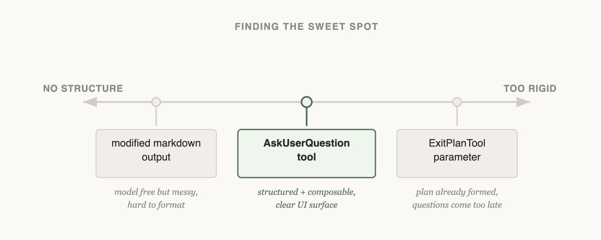 📝 Lessons from Building Claude Code: Seeing like an Agent One of the hardest parts of building an agent harness is constructing its action space. Claude acts through Tool Calling, but there are a number of ways tools can be constructed in the Claude API with primitives like bash, skills and recently code execution (read more about programmatic tool calling on the Claude API in @RLanceMartin's new article). Given all these options, how do you design the tools of your agent? Do you need just one tool like code execution or bash? What if you had 50 tools, one for each use case your agent might run into? To put myself in the mind of the model I like to imagine being given a difficult math problem. What tools would you want in order to solve it? It would depend on your own skills! Paper would be the minimum, but you’d be limited by manual calculations. A calculator would be better, but you would need to know how to operate the more advanced options. The fastest and most powerful option would be a computer, but you would have to know how to use it to write and execute code. This is a useful framework for designing your agent. You want to give it tools that are shaped to its own abilities. But how do you know what those abilities are? You pay attention, read its outputs, experiment. You learn to see like an agent. Here are some lessons we’ve learned from paying attention to Claude while building Claude Code. Improving Elicitation & the AskUserQuestion tool When building the AskUserQuestion tool, our goal was to improve Claude’s ability to ask questions (often called elicitation). While Claude could just ask questions in plain text, we found answering those questions felt like they took an unnecessary amount of time. How could we lower this friction and increase the bandwidth of communication between the user and Claude? Attempt #1 - Editing the ExitPlanTool The first thing we tried was adding a parameter to the ExitPlanTool to have an array of questions alongside the plan. This was the easiest thing to implement, but it confused Claude because we were simultaneously asking for a plan and a set of questions about the plan. What if the user’s answers conflicted with what the plan said? Would Claude need to call the ExitPlanTool twice? We needed another approach. (you can read more about why we made an ExitPlanTool in our post on prompt caching) Attempt #2 - Changing Output Format Next we tried modifying Claude’s output instructions to serve a slightly modified markdown format that it could use to ask questions. For example, we could ask it to output a list of bullet point questions with alternatives in brackets. We could then parse and format that question as UI for the user. While this was the most general change we could make and Claude even seemed to be okay at outputting this, it was not guaranteed. Claude would append extra sentences, omit options, or use a different format altogether. Attempt #3 - The AskUserQuestion Tool Finally, we landed on creating a tool that Claude could call at any point, but it was particularly prompted to do so during plan mode. When the tool triggered we would show a modal to display the questions and block the agent's loop until the user answered. This tool allowed us to prompt Claude for a structured output and it helped us ensure that Claude gave the user multiple options. It also gave users ways to compose this functionality, for example calling it in the Agent SDK or using referring to it in skills. Most importantly, Claude seemed to like calling this tool and we found its outputs worked well. Even the best designed tool doesn’t work if Claude doesn’t understand how to call it. Is this the final form of elicitation in Claude Code? We’re not sure. As you’ll see in the next example, what works for one model may not be the best for another. Updating with Capabilities - Tasks & Todos When we first launched Claude Code, we realized that the model needed a Todo list to keep it on track. Todos could be written at the start and checked off as the model did work. To do this we gave Claude the TodoWrite tool, which would write or update Todos and display them to the user. But even then we often saw Claude forgetting what it had to do. To adapt, we inserted system reminders every 5 turns that reminded Claude of its goal. But as models improved, they not only did not need to be reminded of the Todo List but could find it limiting. Being sent reminders of the todo list made Claude think that it had to stick to the list instead of modifying it. We also saw Opus 4.5 also get much better at using subagents, but how could subagents coordinate on a shared Todo List? Seeing this, we replaced TodoWrite with the Task Tool (read more on Tasks here). Whereas Todos were about keeping the model on track, Tasks were more about helping agents communicate with each other. Tasks could include dependencies, share updates across subagents and the model could alter and delete them. As model capabilities increase, the tools that your models once needed might now be constraining them. It’s important to constantly revisit previous assumptions on what tools are needed. This is also why it's useful to stick to a small set of models to support that have a fairly similar capabilities profile. Designing a Search Interface A particularly important set of tools for Claude are the search tools that can be used to build its own context. When Claude Code first came out, we used a RAG vector database to find context for Claude. While RAG was powerful and fast it required indexing and setup and could be fragile across a host of different environments. More importantly, Claude was given this context instead of finding the context itself. But if Claude could search on the web, why not search your codebase? By giving Claude a Grep tool, we could let it search for files and build context itself. This is a pattern we’ve seen as Claude gets smarter, it becomes increasingly good at build