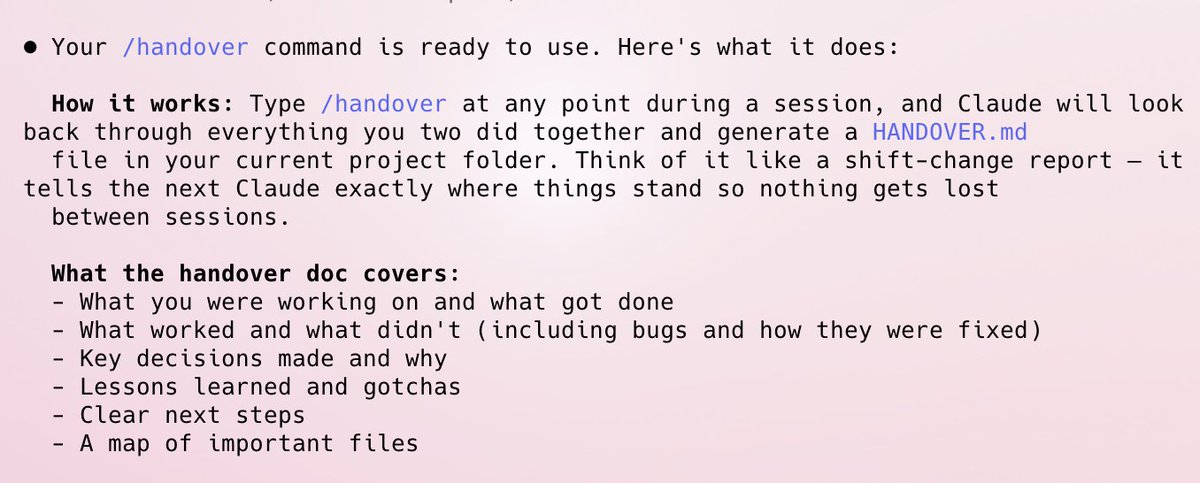 Created a custom slash command "/handover" in Claude Code: When I'm ending a Claude session (e.g. context window filling up), I get Claude to generate a "http://handover.md" document which summarizes everything we did in this session, including decisions, pitfalls, lessons learned, etc. So the next session's Claude has full context. This prevents amnesia and preserves institutional knowledge