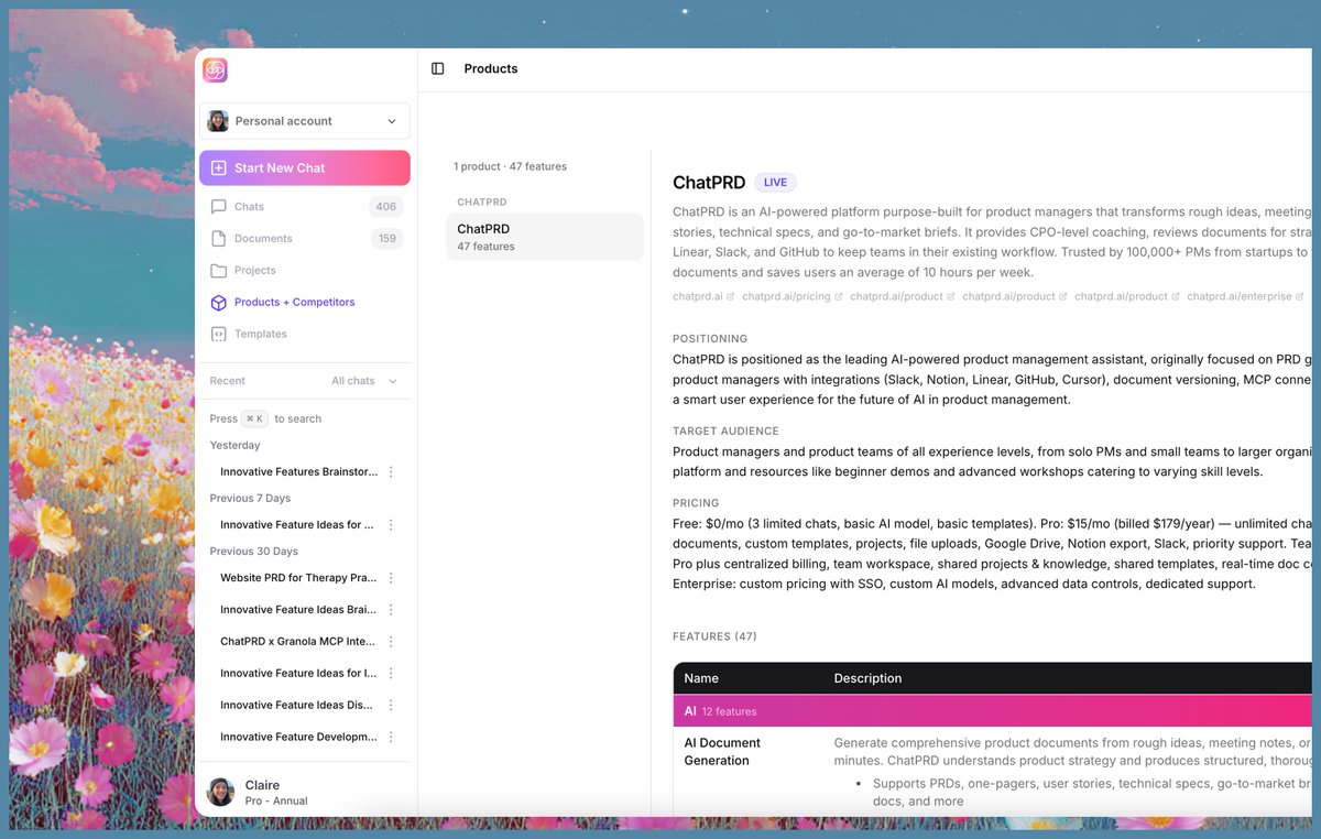 ChatPRD Indexes Company and Competitor Feature Sets