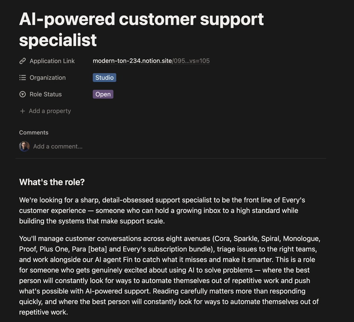 narrative violation: we're hiring a customer support specialist @every! we automate a ton of our support and we want someone to manage the agents and help us make an incredible, personal experience. do you love making customers happy and love AI? apply: https://modern-ton-234.notion.site/AI-po…
