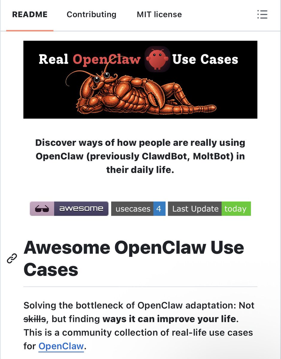 okay so what’s the real use case of OpenClaw? this is the question i see the most. there are >3000 skills available but very few ideas on what to use them for. the ideas get lost in reddit and X. i made a repo for this bottleneck. open a PR and let others know about real use cases. i already started with 4 workflows i already run with my OpenClaw, but i’m calling for contributions. i know people are doing crazy stuff with OpenClaw out there. check it out here: https://github.com/hesamsheikh/awesome-o…