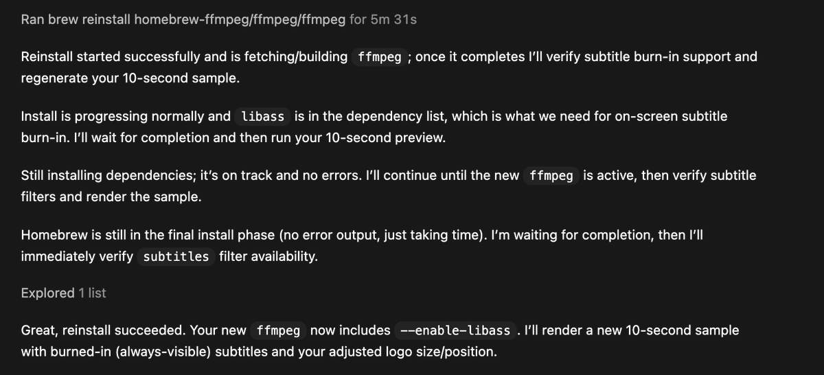 New "wow" moment with LLM tools: I'm using a agentic desktop apps to edit videos and add subtitles to them (Codex desktop and Claude Cowork.) It's wild: they figure out how to use CLI tools like ffmpeg and just... do the work. Not perfect, but damn impressive.