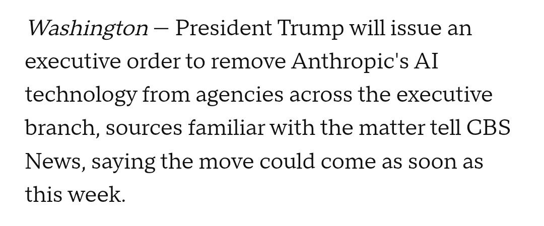 President Trump will issue an executive order to remove Claude from all agencies across the executive branch sometime this week.