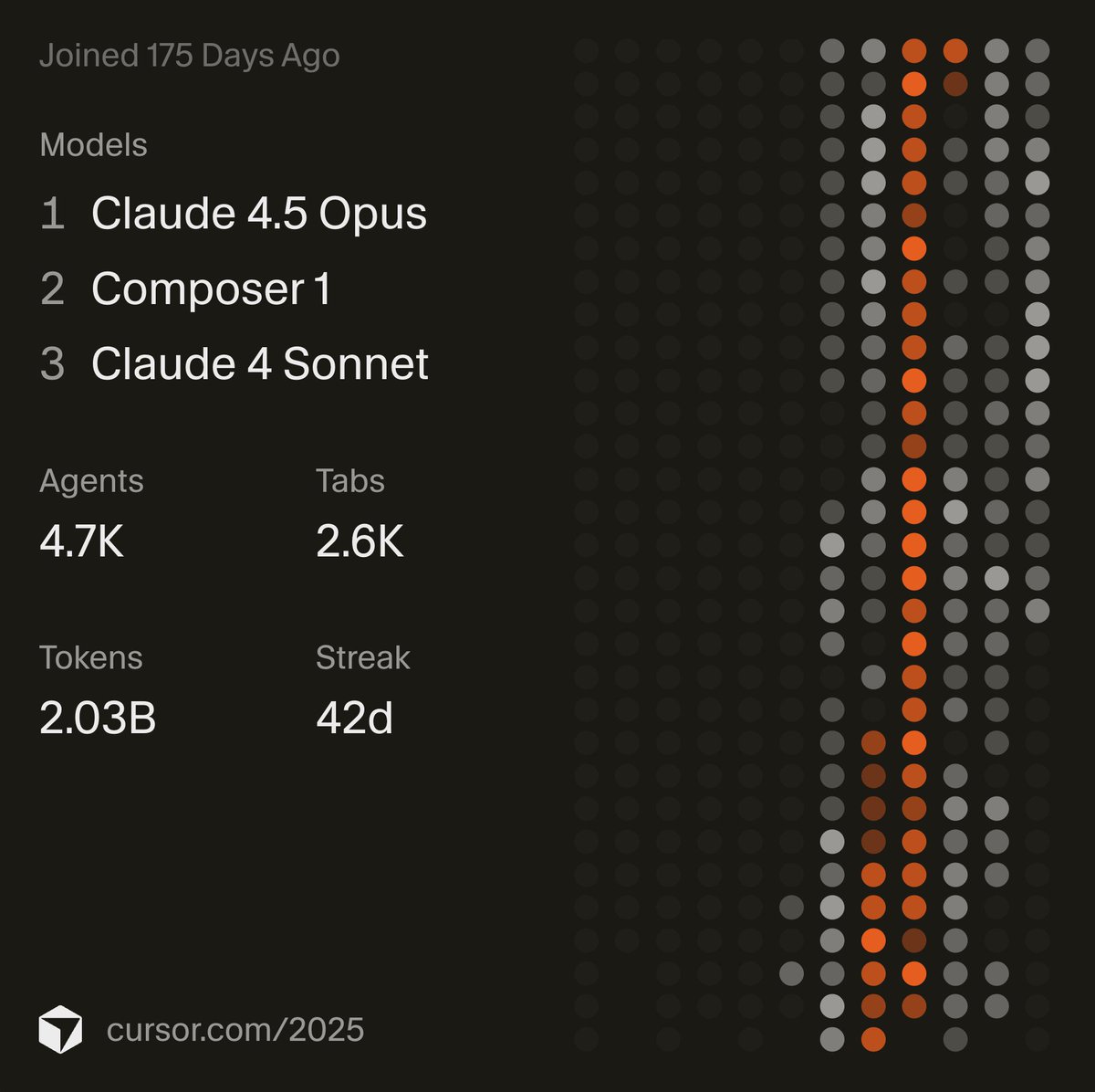 My year in code with Cursor! Well only my past 6 months since I got a team account, so I'm not making the top of any leaderboards haha. Whoever responds with the most tokens used building, I'll send you a bunch of Cursor credits