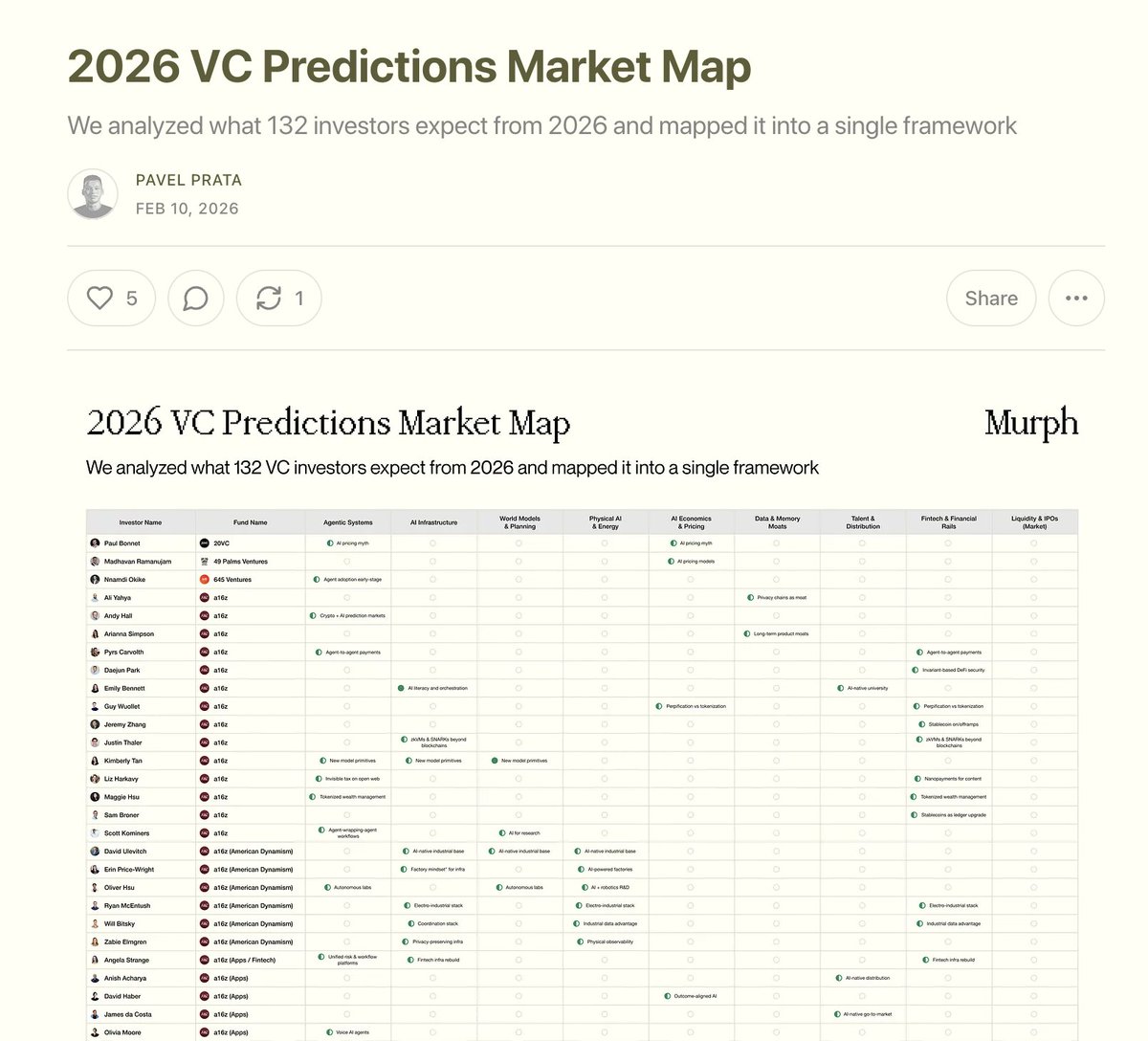 Pavel (@pavelprata) mapped predictions from 132 investors. Common themes: 1. Autonomous AI as the Next Platform Layer 2. AI Infrastructure 3. AI Meets the Real World 4. Rebuilding Payments for an AI-Native Economy 5. AI Economics & Pricing