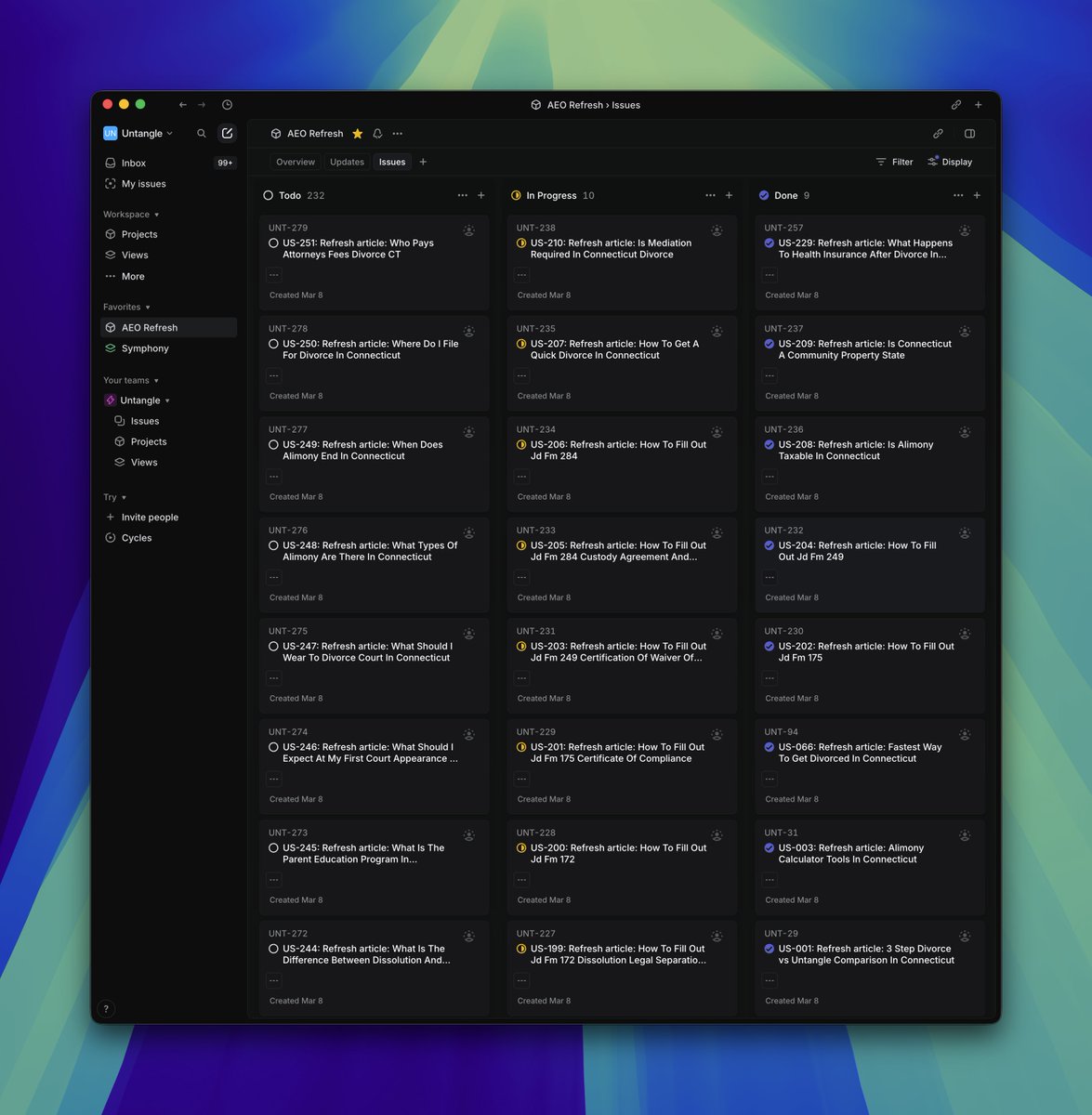 Just got a new MBP M5 and it's creaking under the load of 10 concurrent Codex sessions. By the way, this is an adaptation of Symphony (http://github.com/openai/symphony), running in ralph mode with concurrency set to 10 (these issues/stories can be done in parallel)